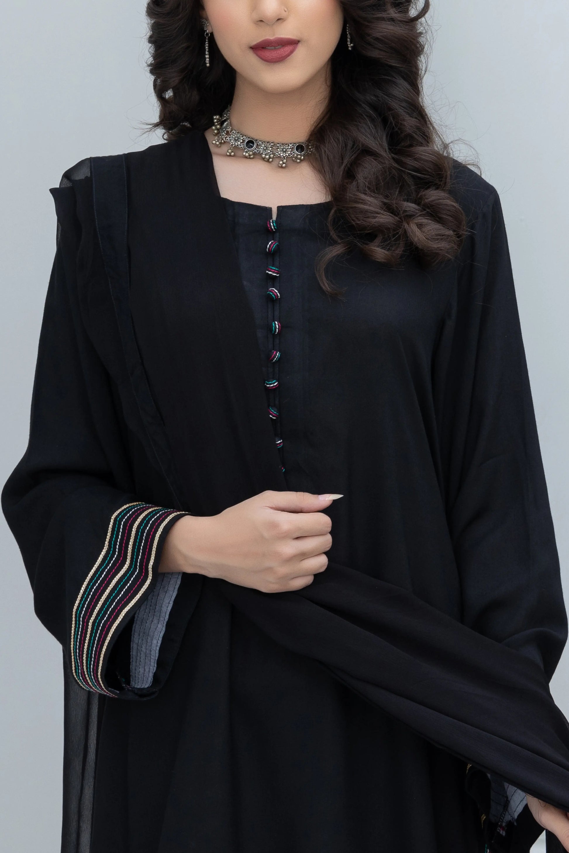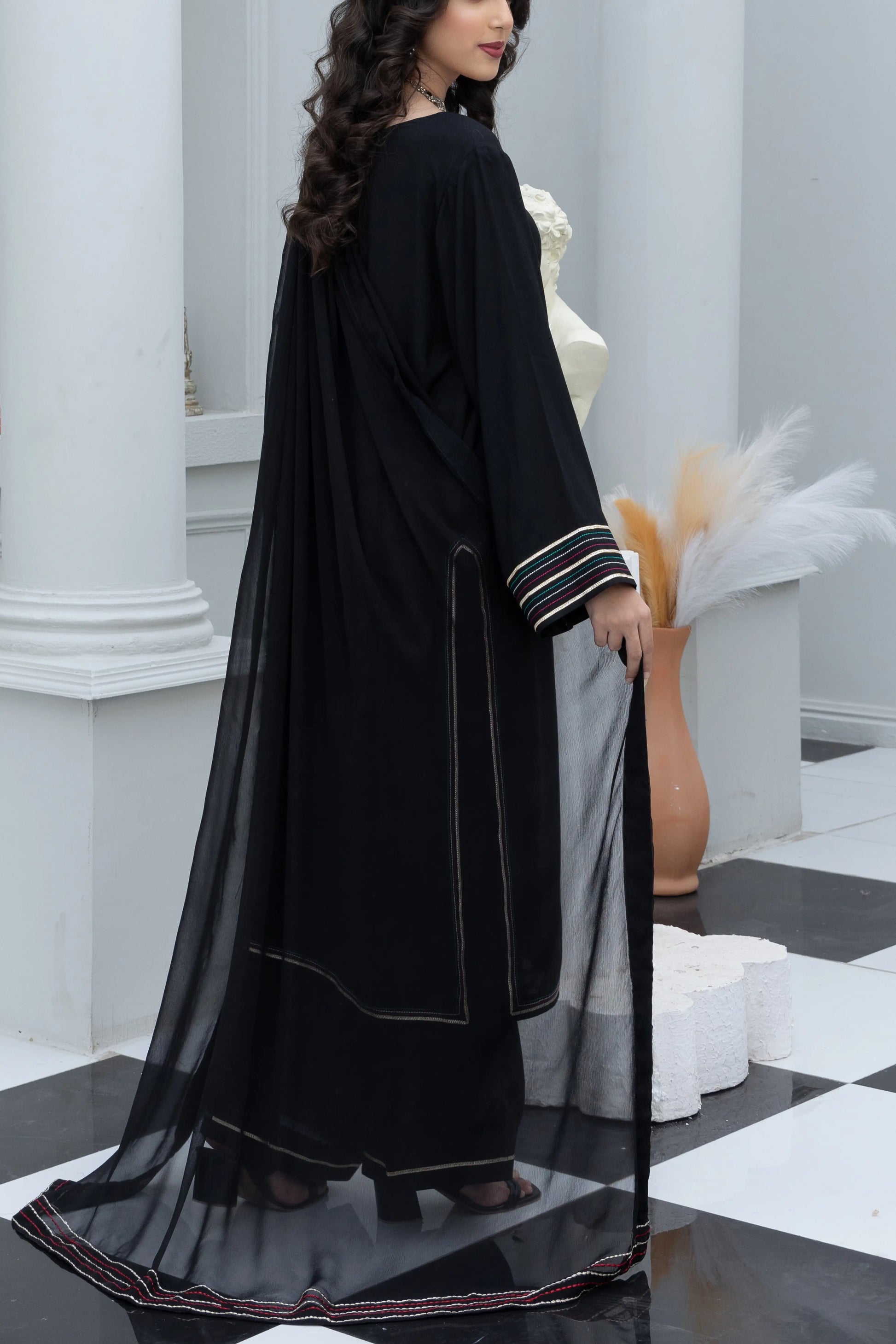 Gracefully understated and timeless, Haya is a classic black ensemble designed for effortless elegance. Featuring a clean silhouette with refined detailing along the front and softly draped sleeves accented with subtle borders, this look balances simplicity with sophistication. Paired with relaxed straight pants and a flowing Chiffon dupatta, Haya is perfect for formal evenings, intimate gatherings, and understated festive occasions—where modesty meets modern grace.