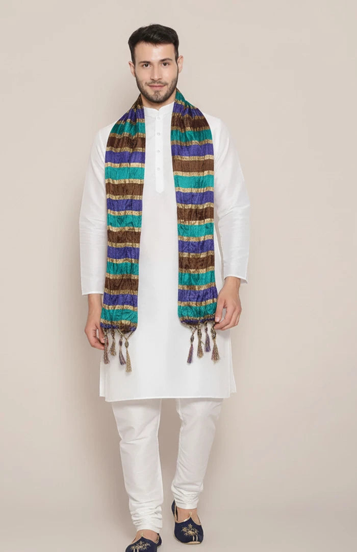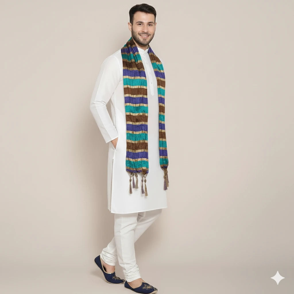 Make your mehndi look stand out with this premium silk dupatta featuring royal blue and green stripes. The soft, shiny fabric with handcrafted tassels adds a festive touch — perfect for groomsmen or friends at wedding functions.